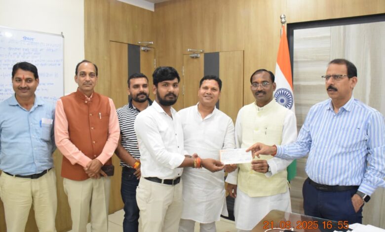सिंगरौली 21 अगस्त 2025/ कृष्ण जन्म अष्टमी पर रामलीला मैदान में आयोजित मटकी फोड़ प्रतियोगिता में भाग लेने वाले विजेता टीम के सदस्यो को आज कलेक्ट्रेट सभागार में सिंगरौली विधानसभा के विधायक राम निवास शाह एवं कलेक्टर चन्द्र शेखर शुक्ला के द्वारा 21-21 हजार रूपयें का चेक देकर सम्मानित किया गया।