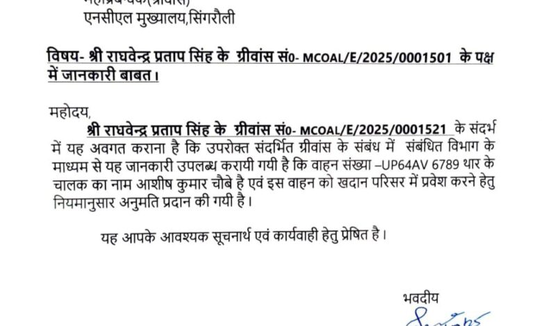 सिंगरौली खड़िया क्षेत्र की खदान में एक चौंकाने वाला मामला सामने आया है। शिकायत निवारण अधिकारी (Nodal Officer – Grievance), खड़िया क्षेत्र, एनसीएल द्वारा महाप्रबंधक (Grievance), एनसीएल मुख्यालय सिंगरौली को भेजे गए पत्र क्रमांक 289 दिनांक 18/10/2025 में स्पष्ट किया गया है कि आशीष चौबे को वाहन नंबर UP64 AV 6789 (थार) का चालक नियुक्त किया गया है। इस जवाब के बाद अब यह सवाल खड़ा हो गया है कि इस थार वाहन का मालिक कौन है, यह वाहन किस कंपनी से जुड़ा हुआ है और किस उद्देश्य से खड़िया खदान में प्रवेश कर रहा है..?