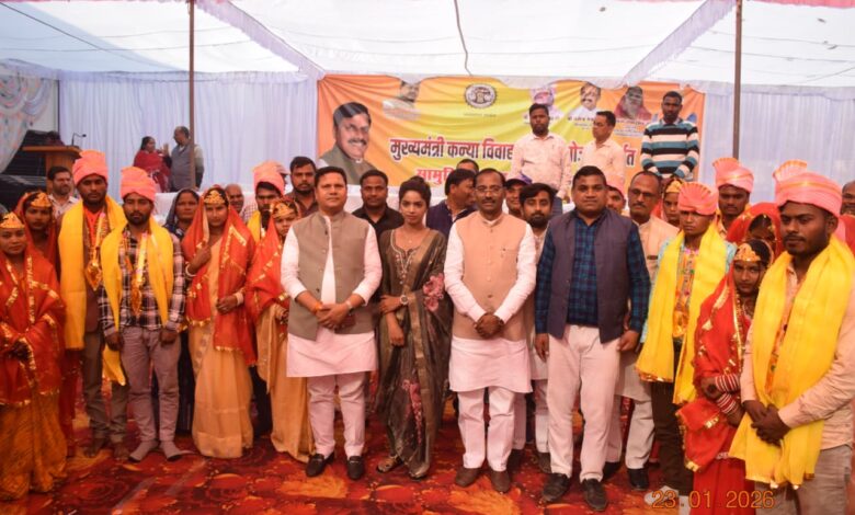 सिंगरौली 23 जनवरी 2026/ अटल सामुदायिक भवन बिलौजी में आयोजित मुख्यमंत्री कन्या विवाह , निकाह कार्यक्रम में 57 जोड़े विवाह बंधन में बध अपने गृहस्थ जीवन की शुरूआत की। समारोह मे पूरे विधि विधान से मत्रोच्चार के बीच नव दम्पत्तियो ने साथ फेरे लिए। इस अवसर पर सिंगरौली विधानसभा के विधायक राम निवास शाह, देवसर विधानसभा के विधायक राजेन्द्र मेश्राम, नगर पालिक निगम सिंगरौली की महापौर रानी अग्रवाल, नगर निगम अध्यक्ष देवेश पाण्डेय, भाजपा जिलाध्यक्ष सुन्दर लाल शाह, जिला पंचायत सदस्य संदीप शाह, एसडीएम सुरेश जाधव, नगर निगम आयुक्त सविता प्रधान सहित उपस्थित जन प्रतिनिधियो ने नव विवाहित जोड़ो पर पुष्प वर्षा के उनके गृहस्थ जीवन की मंगल कमाना की।मख्यमंत्री सामूहिक कन्या विवाह निकाह समारोह में नरीय क्षेत्र के 18 जोड़े एवं जनपद पंचायत बैढ़न क्षेत्र के 37 जोड़ो का विवाह पूरे विधि विधान से सम्पन्न हुआ। इस अवसर पर पार्षद संतोष शाह, नगर निगम उपायुक्त आरपी बैस सहित वर वधु पक्ष के माता पिता रिश्तेदार की उपस्थिति रही।