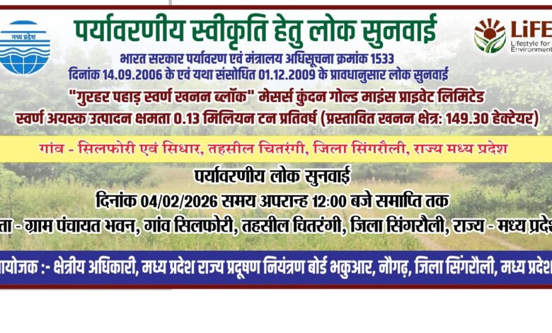 सिंगरौली। जिले के चितरंगी तहसील अंतर्गत गोरहा पहाड़ क्षेत्र में प्रस्तावित स्वर्ण खनन परियोजना के लिए पर्यावरणीय स्वीकृति प्राप्त करने हेतु जनसुनवाई का आयोजन किया गया। यह जनसुनवाई मध्य प्रदेश राज्य प्रदूषण नियंत्रण बोर्ड द्वारा ग्राम पंचायत , सिलफोरी में संपन्न कराई गई, जिसमें बड़ी संख्या में ग्रामीणों, जनप्रतिनिधियों एवं प्रशासनिक अधिकारियों की उपस्थिति रही। जनसुनवाई के दौरान परियोजना प्रस्तावक संस्था मेसर्स कुंदन गोल्ड माइंस प्राइवेट लिमिटेड द्वारा परियोजना से संबंधित विस्तृत जानकारी ग्रामीणों के समक्ष प्रस्तुत की गई। परियोजना का प्रस्तावित क्षेत्रफल 149.30 हेक्टेयर कंपनी के अनुसार गोरहा पहाड़ स्वर्ण खनन ब्लॉक का कुल प्रस्तावित क्षेत्रफल 149.30 हेक्टेयर है। परियोजना के अंतर्गत स्वर्ण अयस्क उत्पादन क्षमता 0.13 मिलियन टन प्रति वर्ष निर्धारित की गई है। वहीं कुल खुदाई क्षमता 1.12 मिलियन टन प्रतिवर्ष होगी, जिसमें 0.13 MTPA स्वर्ण अयस्क 0.99 MTPA अपशिष्ट सामग्री शामिल है। यह परियोजना क्षेत्र में औद्योगिक विकास के साथ-साथ रोजगार के अवसर उपलब्ध कराने की दिशा में महत्वपूर्ण मानी जा रही है।
