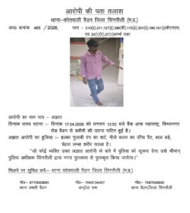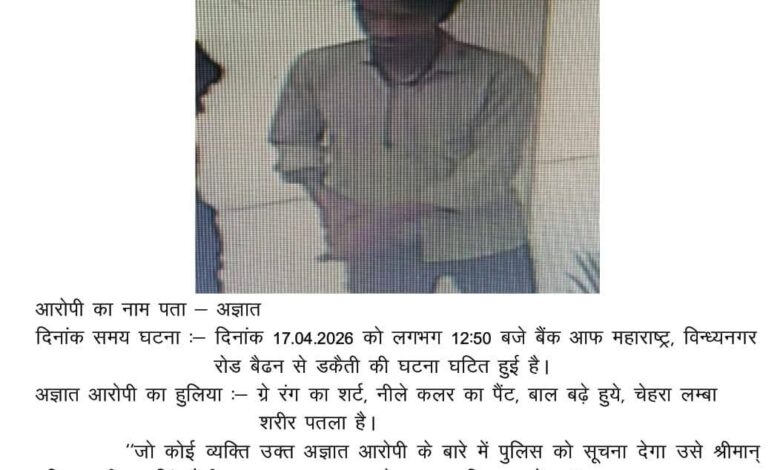 सिंगरौली। जिले के बैढ़न स्थित बैंक ऑफ महाराष्ट्र, विन्ध्यनगर रोड में हुई सनसनीखेज डकैती के मामले में पुलिस ने आरोपियों की गिरफ्तारी के लिए इनाम घोषित किया है। यह घटना 17 अप्रैल 2026 को दोपहर लगभग 12:50 बजे हुई, जब अज्ञात बदमाशों ने बैंक में घुसकर वारदात को अंजाम दिया।मामले में थाना कोतवाली बैढ़न में अपराध क्रमांक 465/2026 के तहत धारा 310(2), 311, 127(2), 296(बी), 115(2), 351(3), 190, 191(3) बीएनएस एवं 25(1)(ए), 27(1) आर्म्स एक्ट के तहत प्रकरण दर्ज किया गया है।इस बीच, प्रदेश के पुलिस महानिदेशक कैलाश मकवाना ने आरोपियों की जानकारी देने वालों के लिए इनाम घोषित किया है। साथ ही, डीजीपी स्वयं इस मामले को गंभीरता से लेते हुए थोड़ी देर में सिंगरौली पहुंचने वाले हैं।